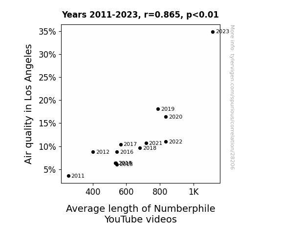 This means 74.9% of the change in the one variable (i.e., Average length of Numberphile YouTube videos) is predictable based on the change in the other (i.e., Air quality in Los Angeles) over the 13 years from 2011 through 2023.