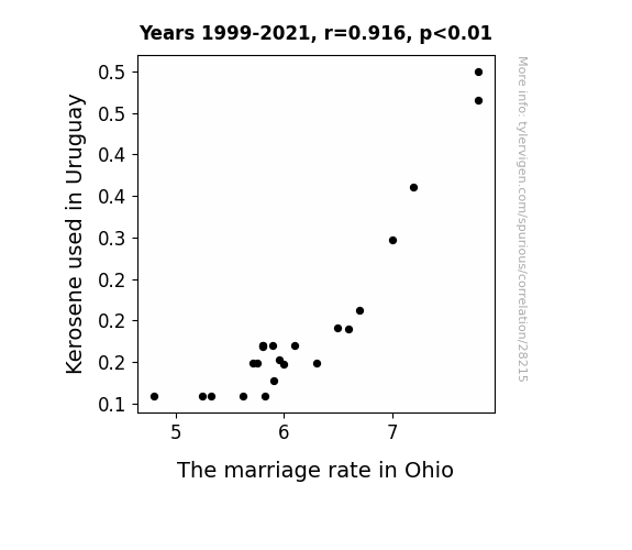 This means 83.9% of the change in the one variable (i.e., The marriage rate in Ohio) is predictable based on the change in the other (i.e., Kerosene used in Uruguay) over the 23 years from 1999 through 2021.