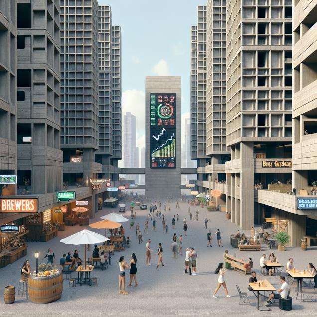 User prompt: Please respond with an image generation prompt that would be likely to create an interesting visual using DALLE-3, using the following style: [ Brutalism ] and depicting this scene: A crowded and vibrant street lined with breweries and beer gardens, where people are enjoying glasses of craft beer and socializing. Meanwhile, on a neighboring street, the stock market ticker on a large electronic board is displaying a steady rise in Ameriprise Financial's stock price, indicating increased demand for financial services. Keep the visual depiction simple. Do not include any words or speech bubbles.