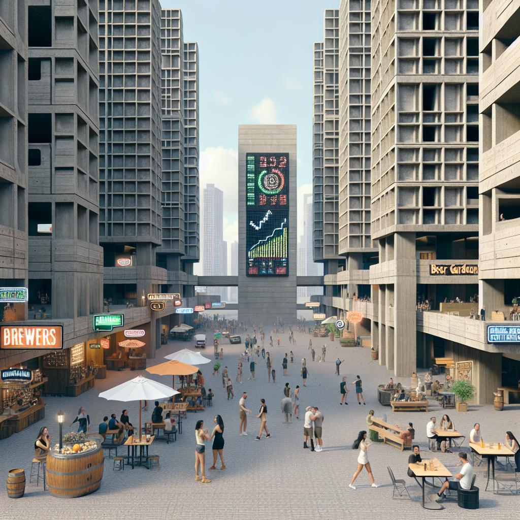 ChatGPT: Generate an image of a bustling cityscape in the style of brutalism. In the foreground, depict a vibrant street teeming with breweries and beer gardens, where people are engaged in conversation, holding glasses of craft beer, and enjoying the lively atmosphere. In the background, showcase a neighboring street with a towering electronic board displaying the animated stock market ticker, highlighting a steady rise in Ameriprise Financial's stock price. Capture the contrast between the social hubbub and the financial market activity while maintaining the architectural aesthetic of brutalism.