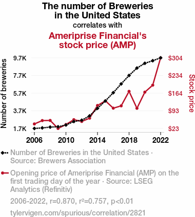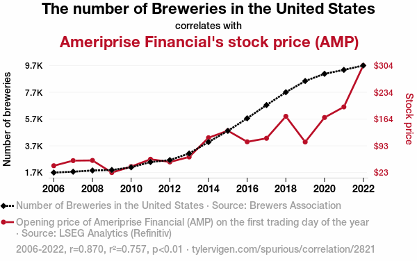 - The spurious research paper: Brewing Up Stock Prices: A Hoppy Correlation Between Brewery Numbers and Ameriprise Financial's Stock (AMP)