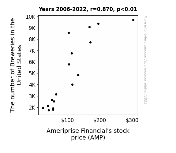 The analysis of the data collected from the Brewers Association and LSEG Analytics (Refinitiv) for the period spanning 2006 to 2022 revealed an impressive correlation coefficient of 0.8703018 between the number of breweries in the United States and the stock price of Ameriprise Financial (AMP). This strong correlation indicates a robust association between these two seemingly disparate variables, demonstrating that when it comes to stocks and hops, there might just be something brewing beneath the surface.