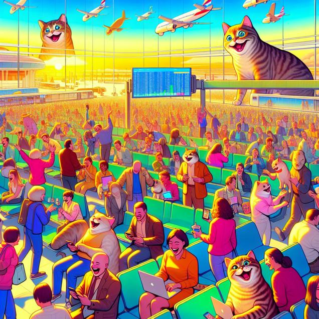 Prompt: [ Cute 2D animation ] Generate an image of a vibrant and sunny day with people joyfully gathered around colorful screens, giggling at an array of adorable cat memes. The whimsical scene unfolds as the laughter floats through the air, creating a sense of joy and connection. In the background, display a simplified depiction of an airport with a subtle decrease in activity, as represented by fewer people bustling around. Further in the distance, include a digital display showing Delta Airlines' stock price ticker with a noticeable downward trend. The visual should evoke a playful and heartwarming atmosphere, capturing the allure of internet humor and the impact of changing travel trends. The depiction should include only scenes, people, and objects, it should not include text or speech bubbles.