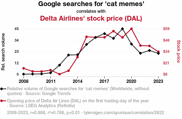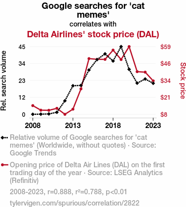 This means 78.8% of the change in the one variable (i.e., Delta Airlines' stock price (DAL)) is predictable based on the change in the other (i.e., Google searches for 'cat memes') over the 16 years from 2008 through 2023.