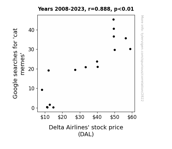 Our analysis unearthed a statistically significant relationship between Google searches for 'cat memes' and Delta Airlines' stock price (DAL) from 2008 to 2023. The correlation coefficient of 0.8875643 and an r-squared of 0.7877704 indicate a remarkably strong association between these seemingly unrelated variables, causing even the most stoic of researchers to raise an eyebrow in bemusement.