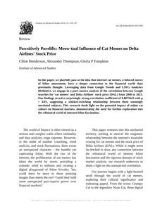 User prompt: Please provide potential search keywords for a paper titled Pawsitively Purrlific: Meow-tual Influence of Cat Memes on Delta Airlines' Stock Price with an abstract of In this paper, we playfully paw at the idea that internet cat memes, a beloved source of feline amusement, have a deeper connection to the financial world than previously thought. Leveraging data from Google Trends and LSEG Analytics (Refinitiv), we engage in a purr-suasive analysis of the correlation between Google searches for 'cat memes' and Delta Airlines' stock price (DAL) from 2008 to 2023. Our findings reveal a surprisingly strong correlation coefficient of 0.8875643 with p < 0.01, suggesting a whisker-twitching relationship between these seemingly unrelated subjects. This research sheds light on the potential impact of online cat culture on financial markets, demonstrating the need for further exploration into the whimsical world of internet feline fascination.