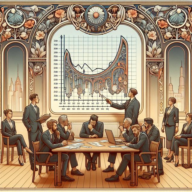 Prompt: Generate an image of an office set in the art nouveau style. Within the office, there is a prominent sign displaying the declining popularity of the name "Jamesha" over the years. Close by, several employees at Mizuho Financial Group appear disheartened as they observe a chart indicating the decrease in the number of people named Jamesha working at the company. As their morale wanes, an evident drop in productivity is reflected by a line graph showing the downward trend of Mizuho Financial Group's stock price (MFG) displayed on a nearby screen. Reflect the somber mood of the employees and the impact of the declining trend through the sophisticated art nouveau visuals. The depiction should include only scenes, people, and objects, it should not include text or speech bubbles.