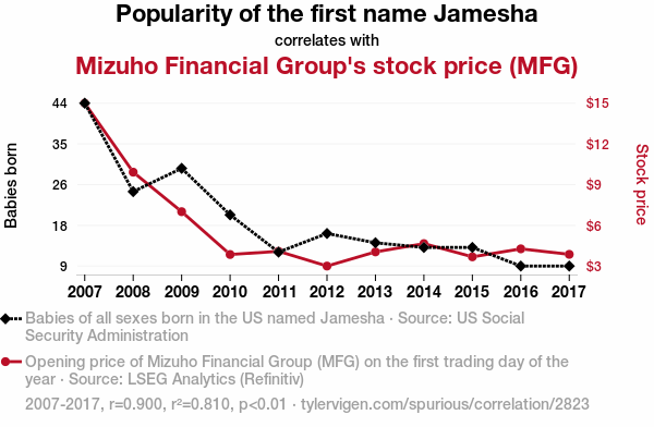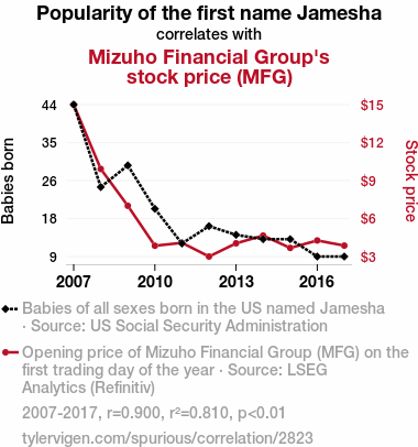 User prompt: Please provide potential search keywords for a paper titled Mingling of Mizuho: Examining the Effect of the Popularity of the Name Jamesha on Mizuho Financial Group's Stock Price with an abstract of The stock market has long been an enigma, much like the timeless question: "What do you call a fish wearing a crown? Anemone!" In this paper, we delve into the peculiar connection between the popularity of the first name Jamesha and the stock price of the esteemed Mizuho Financial Group (MFG). With a twinkle in our eye and curiosity in our hearts, we used data from the US Social Security Administration and LSEG Analytics (Refinitiv) to assess this seemingly far-fetched correlation. Our findings revealed a correlation coefficient of 0.8999015 and a significant p-value of < 0.01 for the years 2007 to 2017, leaving us saying, "That's a bullish figure," in more ways than one.