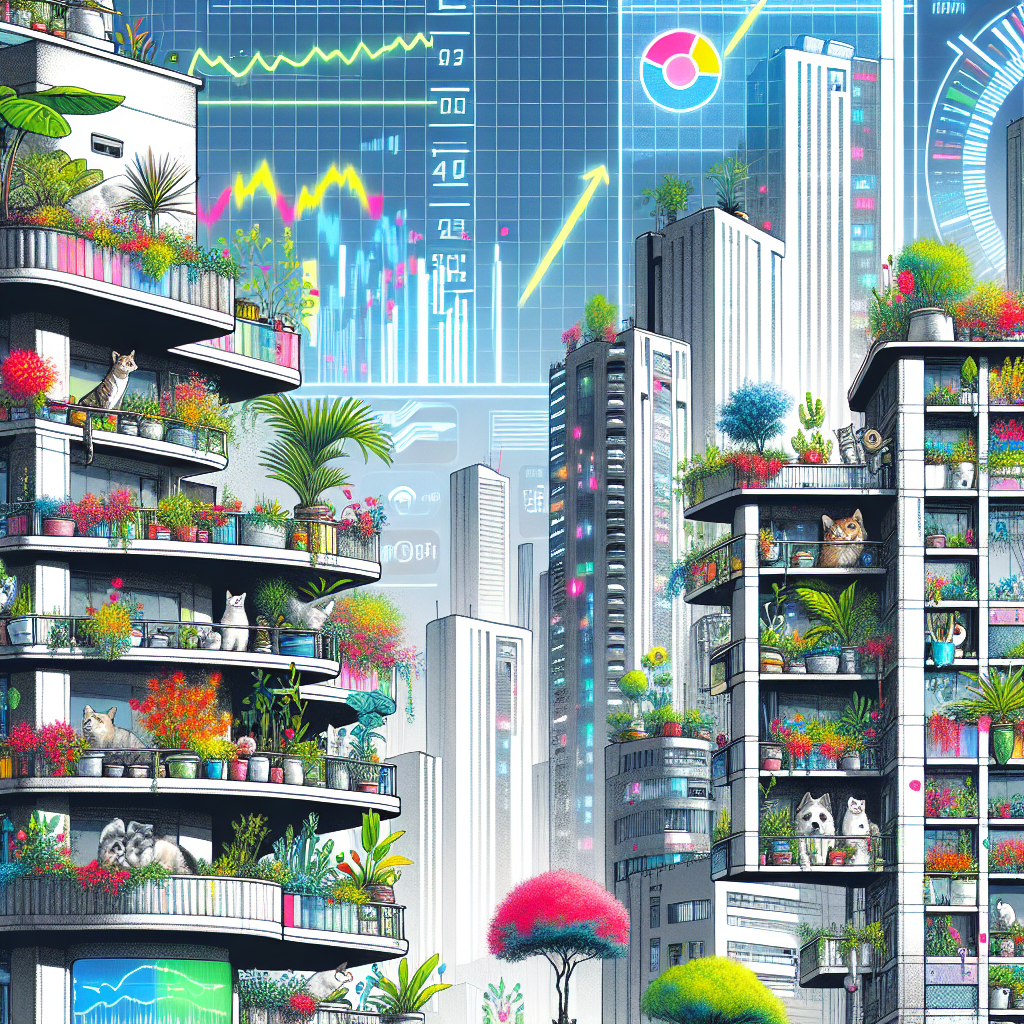User prompt: Please respond with an image generation prompt that would be likely to create an interesting visual using DALLE-3, using the following style: [ High-tech ] and depicting this scene: In a bustling city, a digital billboard flashes with the words "Niko" in bold letters, indicating the rising popularity of the name. Surrounding the billboard, there are a variety of pets and plants peeking out from apartment windows and balconies, all named Niko. Meanwhile, on a nearby stock market ticker, the Mastercard (MA) stock price surges upward, reflecting the increase in online purchases driven by the booming trend of pet and plant Instagram accounts. Keep the visual depiction simple. Do not include any words or speech bubbles.