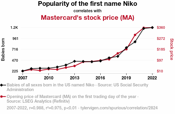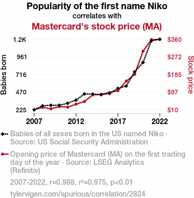 - The spurious research paper: Charging Up the Stock Market: The Niko-nnection Between Name Popularity and Mastercard's Stock Price