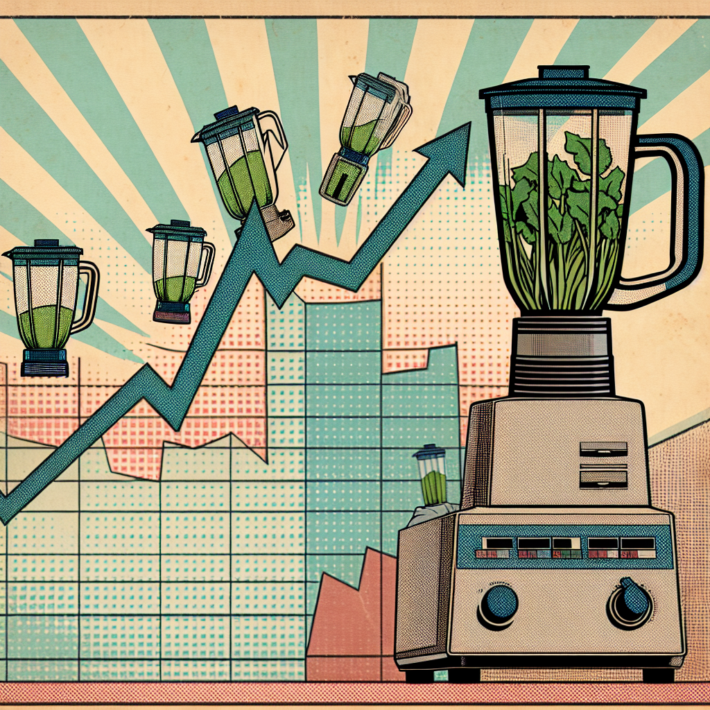 Prompt: Generate a comic-book-style illustration with muted colors and a dotted halftone pattern from the 1960s. The scene depicts a line graph showing a steady increase in annual US household spending on fresh vegetables. Next to it, there's a stock market chart with Cummins' (CMI) stock price also steadily rising. At the center of the scene, there's a display of blenders flying off the shelves, illustrating the increased demand due to families buying more blenders to make green smoothies with all those fresh vegetables. The depiction should include only scenes, people, and objects, it should not include text or speech bubbles.