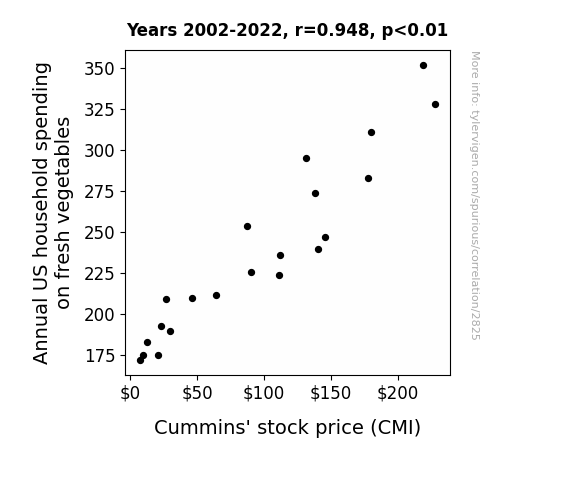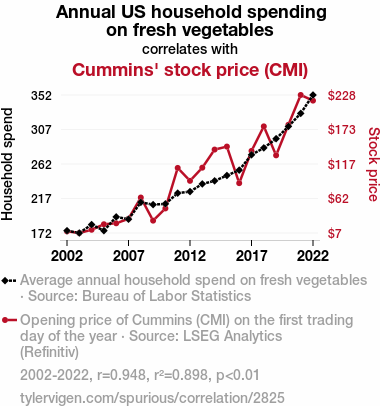 - The spurious research paper: Stocked Up on Greens: Unearthing the Correlation Between Annual US Household Spending on Fresh Vegetables and Cummins' Stock Price