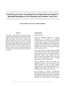 User prompt: Please provide potential search keywords for a paper titled Stocked Up on Greens: Unearthing the Correlation Between Annual US Household Spending on Fresh Vegetables and Cummins' Stock Price with an abstract of In this paper, we dig deep into the connection between annual US household spending on fresh (and not-so-fresh) vegetables and the stock performance of Cummins Inc. (CMI). This veggie venture into the financial world involved analyzing data from the Bureau of Labor Statistics and LSEG Analytics (Refinitiv) to finally shed light on this unlikely relationship. Our research uncovered a surprising correlation coefficient of 0.9475616 and a p-value less than 0.01 for the years 2002 to 2022. So, whether it's roots or stocks, it seems that the produce aisle may hold more investment insights than we previously kale-culated!