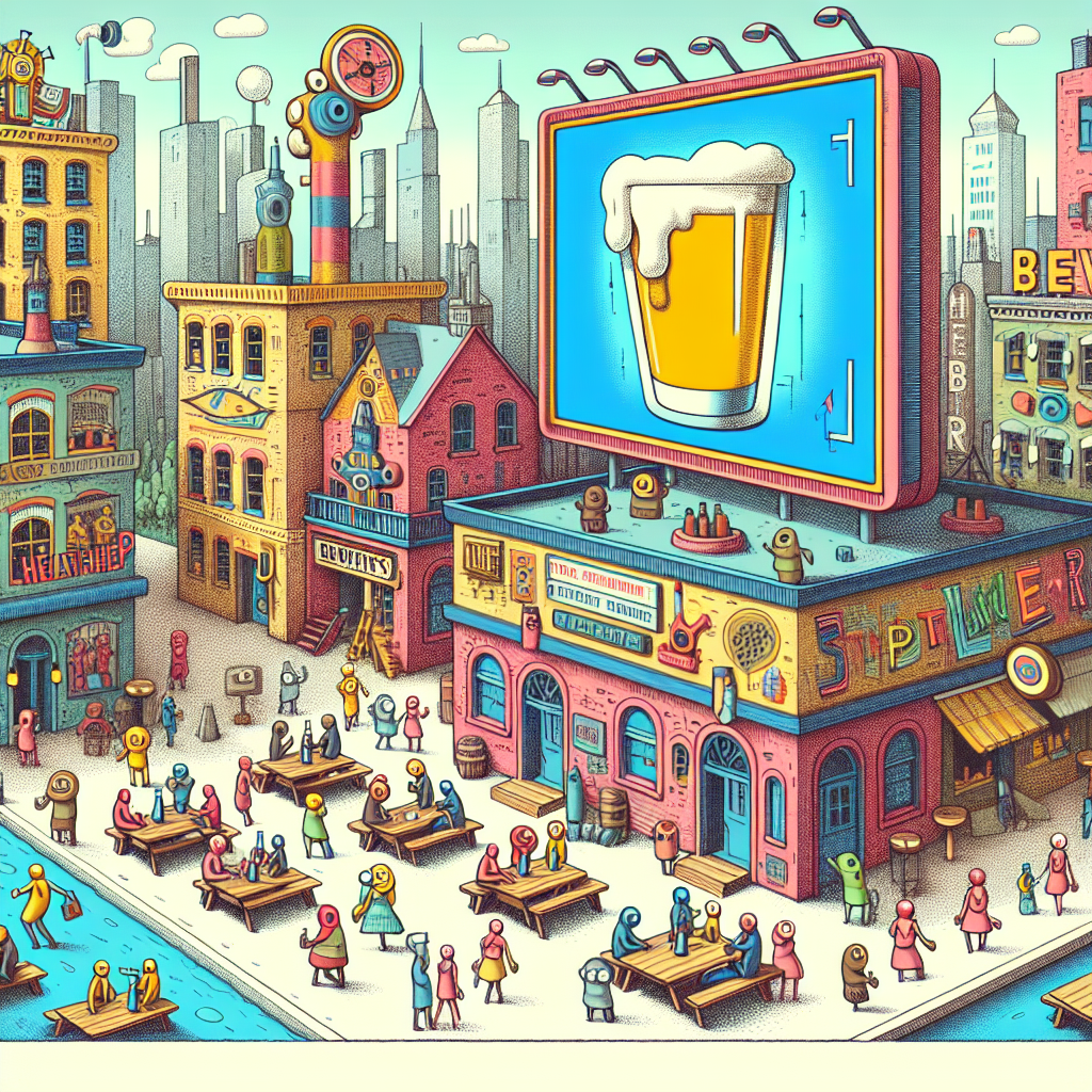 Prompt: An image that looks like it is a scene from a Disney movie, showing a bustling cityscape with colorful and whimsical breweries popping up on every corner. The buildings are adorned with vibrant signs, and outdoor seating is filled with animated characters enjoying craft beer. Meanwhile, a prominent digital screen displays the soaring stock price of Humana (HUM) intertwined with playful visuals representing the increase in healthcare coverage demand due to beer-related injuries. The depiction should include only scenes, people, and objects, it should not include text or speech bubbles.