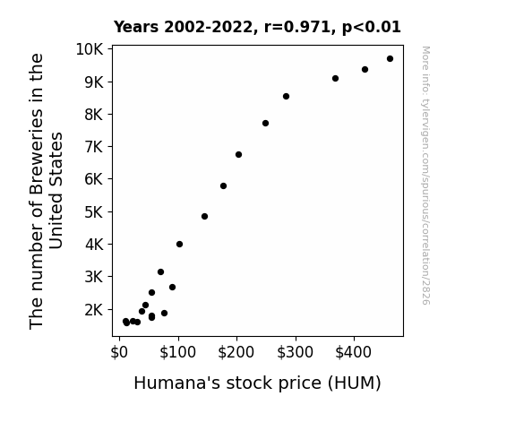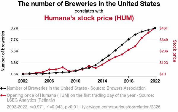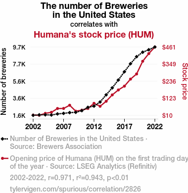 - The spurious research paper: Brew-nomics and Stock Spirits: A Sudsy Look at the Relationship Between U.S. Brewery Count and Humana's Stock Price