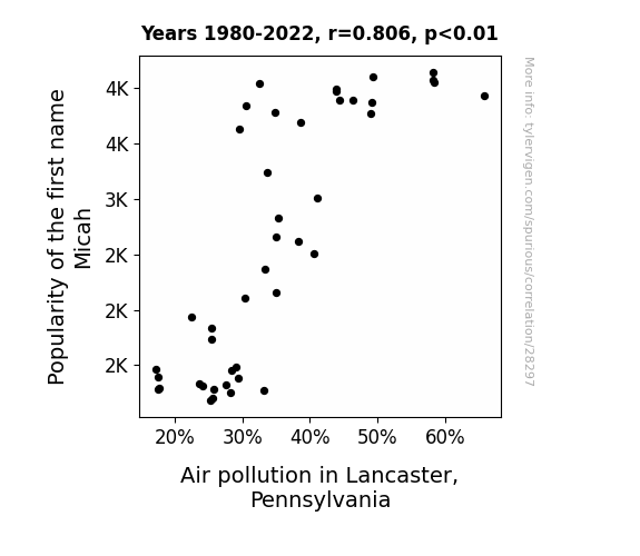 This means 65% of the change in the one variable (i.e., Air pollution in Lancaster, Pennsylvania) is predictable based on the change in the other (i.e., Popularity of the first name Micah) over the 43 years from 1980 through 2022.