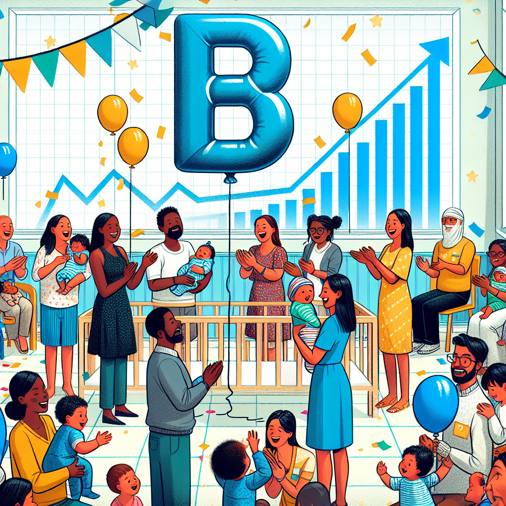 Prompt: Generate an image showing a lively nursery room filled with parents looking joyfully at a huge "B" balloon. The balloon stands out amidst the excited crowd, with the Zimmer Biomet Holdings (ZBH) stock ticker prominently displayed on the wall, depicting a significant upward trend. The scene captures the trend of the name Bo and its impact on both the celebratory atmosphere in the nursery and the rising stock price. The depiction should include only scenes, people, and objects, it should not include text or speech bubbles.