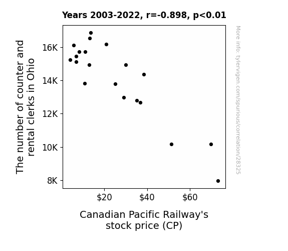 This means 80.6% of the change in the one variable (i.e., Canadian Pacific Railway's stock price (CP)) is predictable based on the change in the other (i.e., The number of counter and rental clerks in Ohio) over the 20 years from 2003 through 2022.