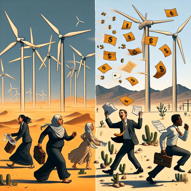 User prompt: Please respond with an image generation prompt that would be likely to create an interesting visual using DALLE-3, using the following style: [ a funny image you would see on reddit ] and depicting this scene: Picture a vast expanse of desert in Mauritania, where rows of sleek wind turbines spin steadily, harnessing the strong gusts to generate renewable Wind power. Meanwhile, in the tranquil state of Idaho, a group of accountants and auditors are flurried about, their paperwork being blown away by the powerful winds from Mauritania. As the wind carries their documents in a whirl, it leads to a surge in the need for their services to audit the burgeoning Wind power industry, creating a "windfall" of new jobs. Keep the visual depiction simple. Do not include any words or speech bubbles.
