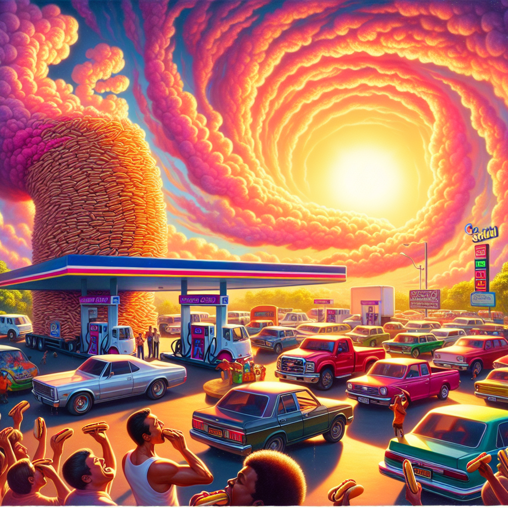 User prompt: Please respond with an image generation prompt that would be likely to create an interesting visual using DALLE-3, using the following style: [ An image that looks like it is a scene from A Disney Movie ] and depicting this scene: In Suriname, cars and trucks line up at a busy gas station, pumping fossil fuels into their tanks. The air is hazy with exhaust fumes. Meanwhile, at the Nathan's Hot Dog Eating Competition, the reigning champion is surrounded by a mountain of hot dogs, competing under the scorching sun as spectators cheer on. Keep the visual depiction simple. Do not include any words or speech bubbles.