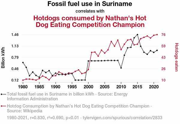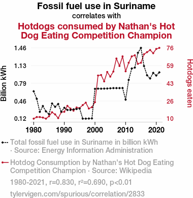 - The spurious research paper: Fueling the Fun: A Link Between Fossil Fuel Use in Suriname and Nathan's Hot Dog Eating Competition Champion's Consumption