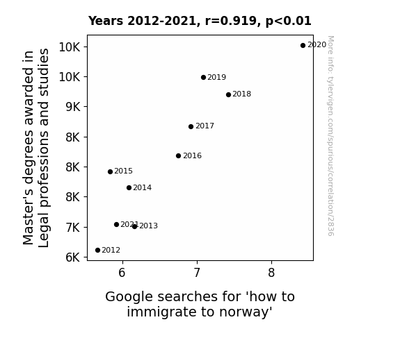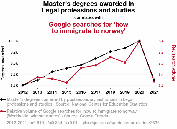 This means 84.4% of the change in the one variable (i.e., Google searches for 'how to immigrate to norway') is predictable based on the change in the other (i.e., Master's degrees awarded in Legal professions and studies) over the 10 years from 2012 through 2021.