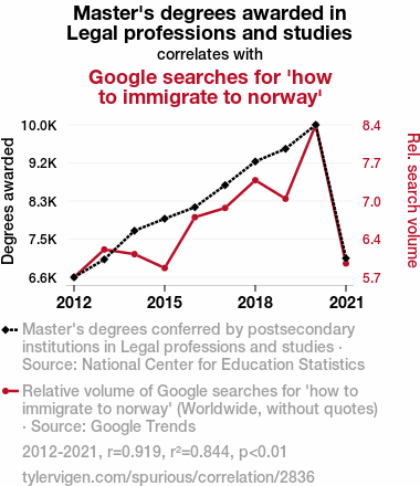 User prompt: Please make up a funny explanation for how increases in Master's degrees awarded in Legal professions and studies positively influenced how to immigrate to norway (Google searches for 'how to immigrate to norway').