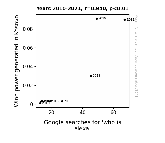 - The spurious research paper: Blowing in the Wind: Unveiling the Relationship Between Wind Power Generation in Kosovo and the Curious Searches for 'Who is Alexa' on Google