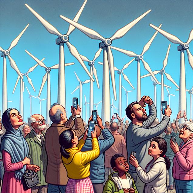 ChatGPT: Generate an image of a cartoonish wind turbine farm in Kosovo with large, comically exaggerated wind turbines spinning gracefully in the wind. Surrounding the turbines, show curious people looking up at the turbines with puzzled expressions, while others can be seen searching on their smartphones with a look of intrigue. The scene should be lighthearted and humorous, capturing the unique moment of people relating the sound of the turbines to a virtual assistant.