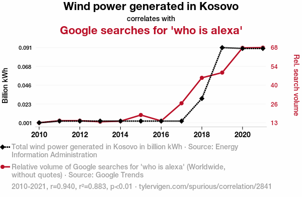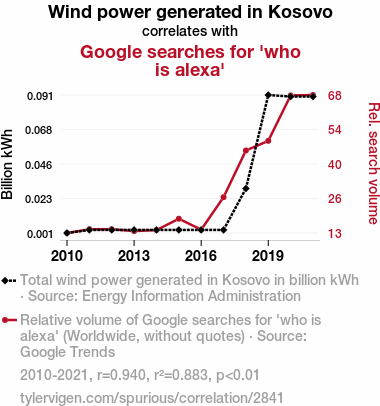 - The spurious research paper: Blowing in the Wind: Unveiling the Relationship Between Wind Power Generation in Kosovo and the Curious Searches for 'Who is Alexa' on Google