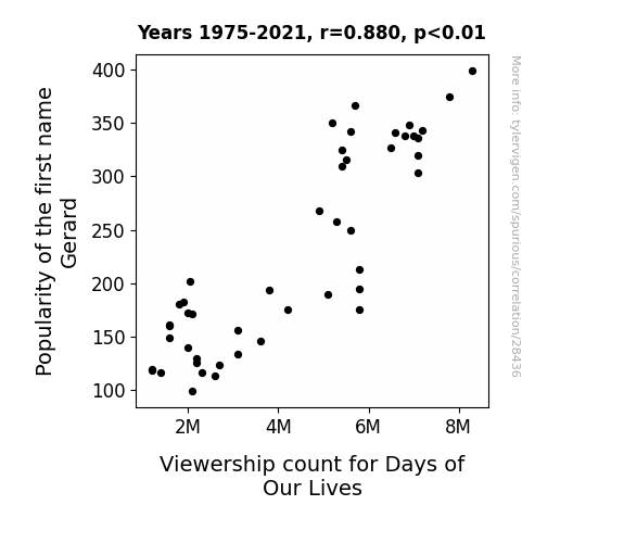 This means 77.4% of the change in the one variable (i.e., Viewership count for Days of Our Lives) is predictable based on the change in the other (i.e., Popularity of the first name Gerard) over the 47 years from 1975 through 2021.