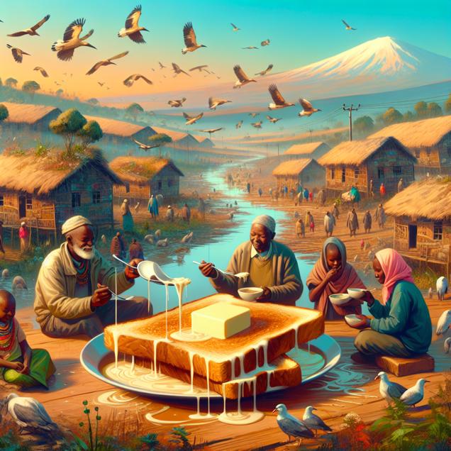 User prompt: Please describe a visual scene that prominently depicts both Butter consumption and Geothermal power generated in Kenya, in the following situation: Because the extra butter consumption led to people having slippery fingers, causing them to drop their toast more often. The crumbs from the toast attracted large numbers of geothermal-loving birds, increasing the bird population in the area. The movement of the birds on the ground caused mini earthquakes, which in turn increased the availability of geothermal power in Kenya.. Keep the description simple.