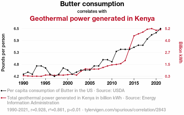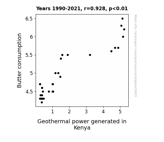 This means 86.1% of the change in the one variable (i.e., Geothermal power generated in Kenya) is predictable based on the change in the other (i.e., Butter consumption) over the 32 years from 1990 through 2021.