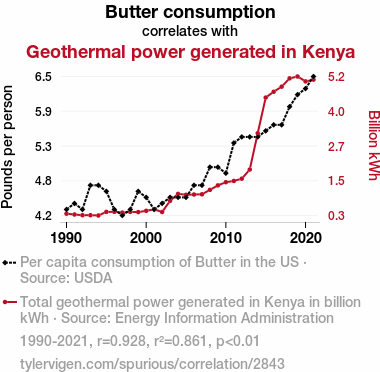 A linear line chart with years as the X-axis and two variables on the Y-axis. The first variable is Butter consumption and the second variable is Geothermal power generated in Kenya.  The chart goes from 1990 to 2021, and the two variables track closely in value over that time. Small Image