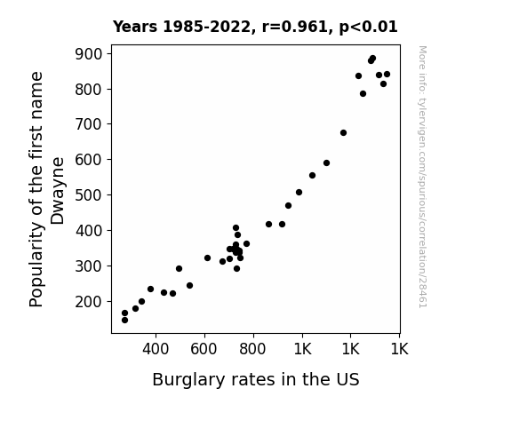 This means 92.4% of the change in the one variable (i.e., Burglary rates in the US) is predictable based on the change in the other (i.e., Popularity of the first name Dwayne) over the 38 years from 1985 through 2022.