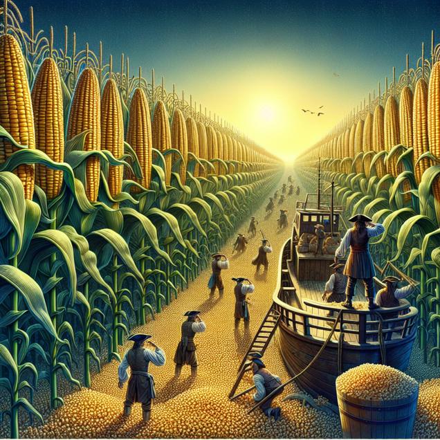 ChatGPT: Generate a visual of a vast Indiana cornfield under a bright sun, with genetically modified corn stalks swaying in the breeze. The corn is large and healthy, bearing robust ears bursting with golden kernels. In the foreground, a group of pirates are depicted on a swaying ship, looking longingly at a dwindling supply of popcorn. The pirates appear restless, with their map of potential targets nearby and untouched.