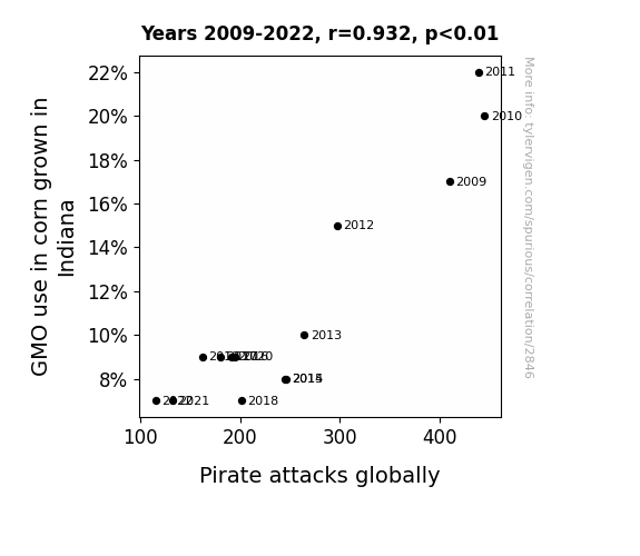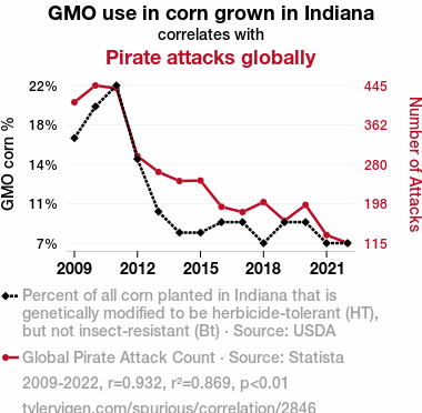 - The spurious research paper: Unraveling the Kernel of Truth: Investigating the Correlation Between GMO Corn Production in Indiana and Global Pirate Attacks
