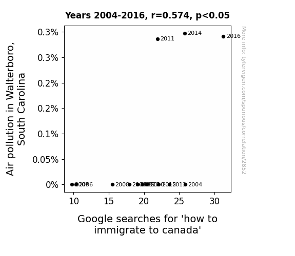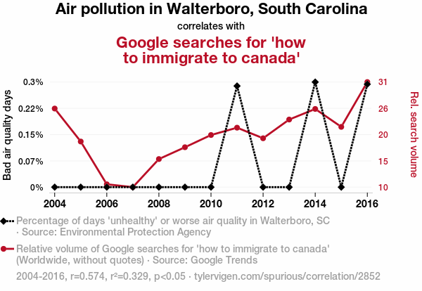 - The spurious research paper: Breath of Fresh Air: The Correlation Between Air Pollution in Walterboro, South Carolina, and Google Searches for 'how to immigrate to canada'