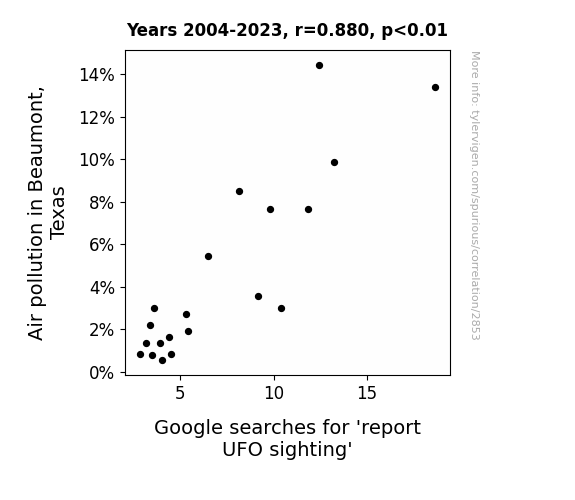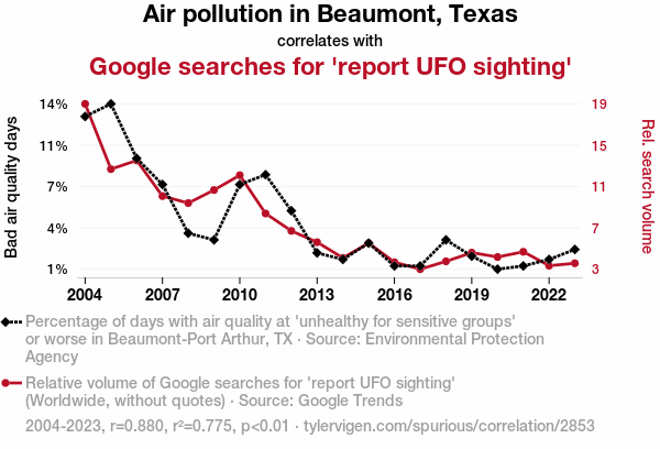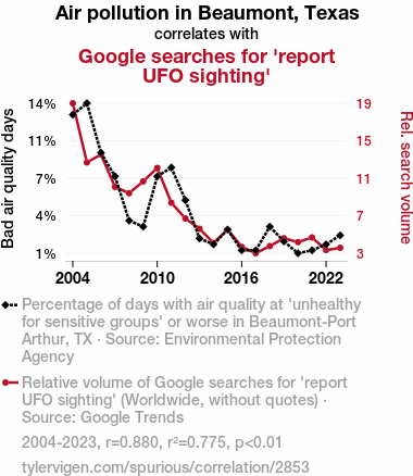 - The spurious research paper: In the Search of Extraterrestrial Smog: The Correlation between Air Pollution in Beaumont, Texas and Google Searches for 'Report UFO Sighting'