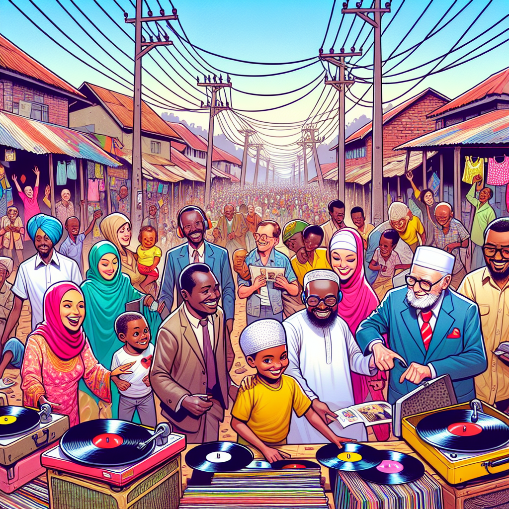 Prompt: [ A comical cartoon of a bustling street in Burundi, with power lines crackling with energy above. In the foreground, people excitedly gather around vintage turntables, their eyes lighting up as they select and purchase old-school records. The bright and colorful scene exudes nostalgic charm, capturing the retro music trend in a humorous and heartwarming light. ] The depiction should include only scenes, people, and objects, it should not include text or speech bubbles.