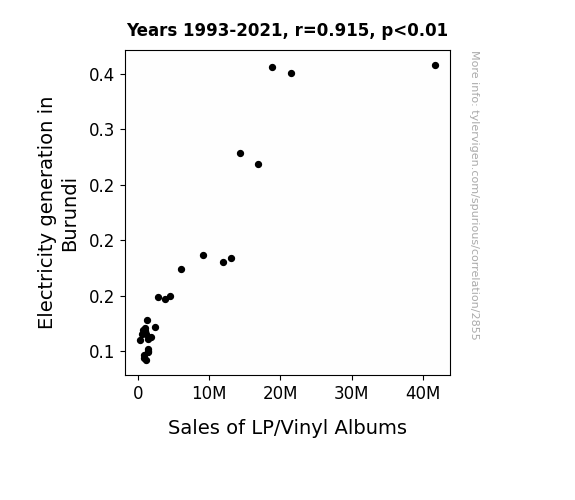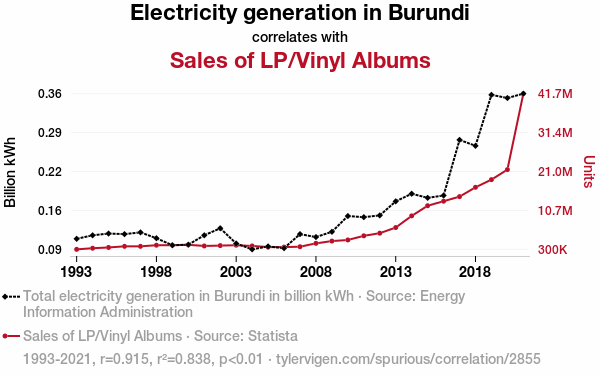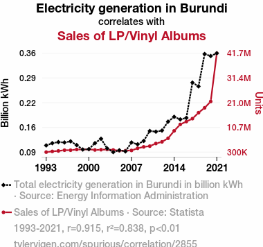 - The spurious research paper: Electrifying Economics: Exploring the Connection Between Electricity Generation in Burundi and Sales of LP/Vinyl Albums