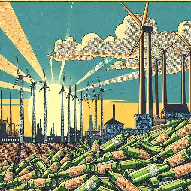Prompt: Create an image with a nostalgic comic-book style, using muted colors and a dotted halftone pattern from the 1960s. Depict a scene where a growing number of breweries across the United States are shown, each producing more beer and leading to an increase in discarded glass bottles. With the sunlight passing through these bottles, create a shimmering effect, reflecting extra sunlight towards Norway. Illustrate the increase in sunlight leading to better wind patterns, ultimately boosting the production of wind power in Norway. Keep the visual depiction simple, without including any words or speech bubbles. The depiction should include only scenes, people, and objects, it should not include text or speech bubbles.