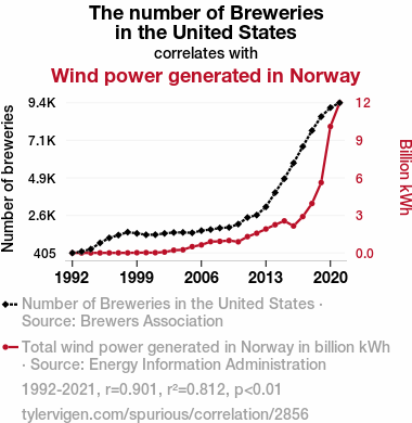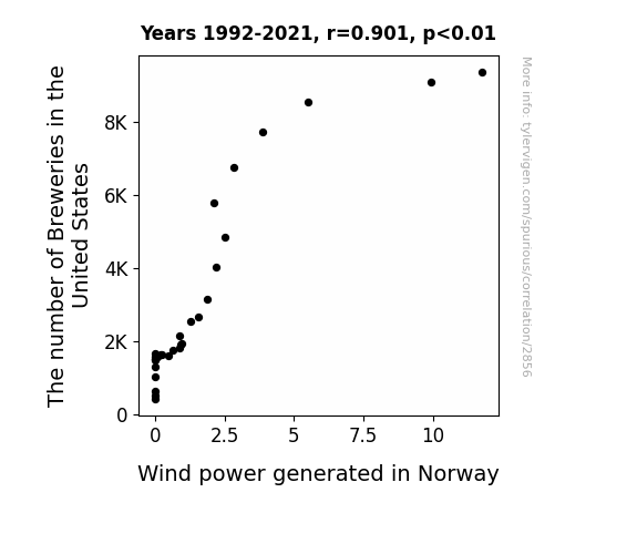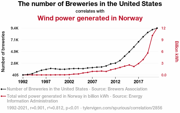 This means 81.2% of the change in the one variable (i.e., Wind power generated in Norway) is predictable based on the change in the other (i.e., The number of Breweries in the United States) over the 30 years from 1992 through 2021.