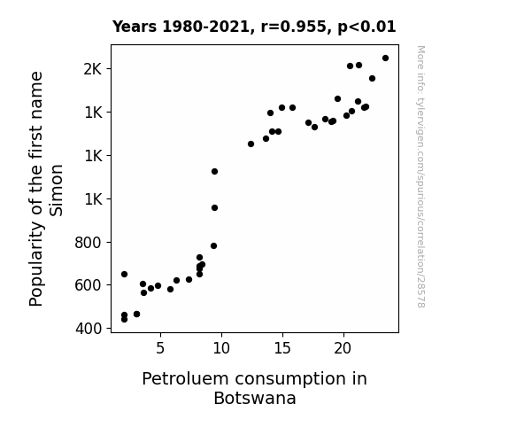 This means 91.2% of the change in the one variable (i.e., Petroluem consumption in Botswana) is predictable based on the change in the other (i.e., Popularity of the first name Simon) over the 42 years from 1980 through 2021.