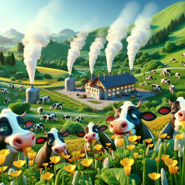 ChatGPT: In a lush Romanian countryside, we see happy cows grazing in a vibrant green pasture, with a quaint dairy farm in the background. The scene depicts these content cows munching on golden buttercups and enjoying a higher amount of butter consumption. As the cows cheerfully munch away, we notice little puffs of methane gas rising from the grass, symbolizing their increased gassiness. The methane is collected and used to power large biomass generators nearby, symbolizing the increase in biomass power generated in Romania due to the cows' methane production.