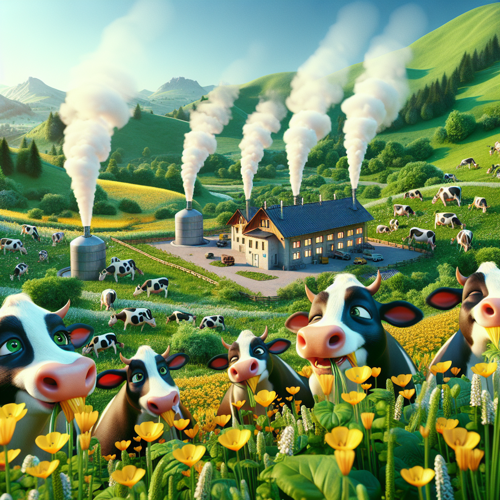 Prompt: Consider using the following prompt to create an engaging visual with a Pixar-like style: "Generate an image that resembles a scene from a Pixar movie. Depict a picturesque countryside in Romania, featuring delightful cows contentedly grazing in a vivid green pasture beside a charming dairy farm. The cows are depicted munching on golden buttercups with evident pleasure and delight. They exude an overall sense of happiness and are surrounded by an abundance of lush, vibrant greenery. Illustrate little puffs of methane gas rising from the grass near the cows, symbolizing their increased gassiness. Emphasize the utilization of the collected methane to power large biomass generators nearby, highlighting the increase in biomass power generation in Romania due to the cows' methane production. The visuals should capture the whimsical nature and delightful charm characteristic of a Pixar movie." The depiction should include only scenes, people, and objects, it should not include text or speech bubbles.