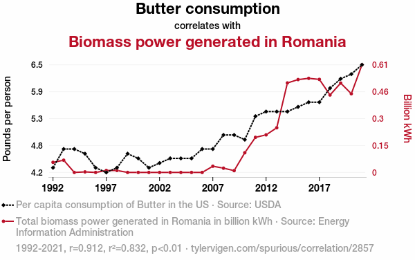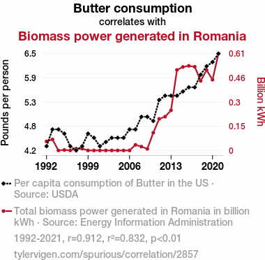 This means 83.2% of the change in the one variable (i.e., Biomass power generated in Romania) is predictable based on the change in the other (i.e., Butter consumption) over the 30 years from 1992 through 2021.