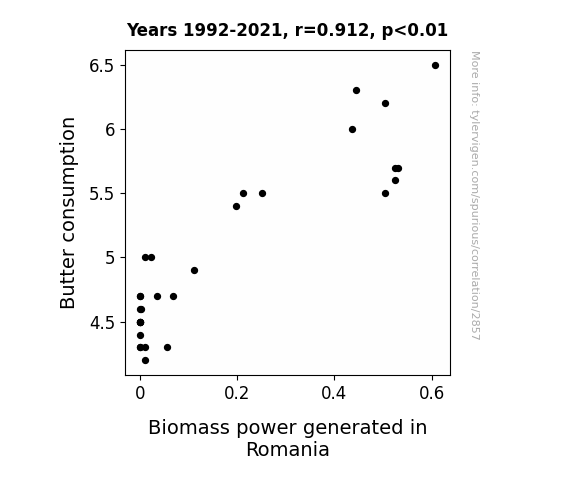 The results of our analysis reveal a strong correlation of 0.9118929 between butter consumption and biomass power generated in Romania over the 1992-2021 period. This finding suggests that as butter consumption increased, so did the production of biomass power. It seems that with great power comes great dairy responsibility! It’s udderly remarkable how this correlation churns out.