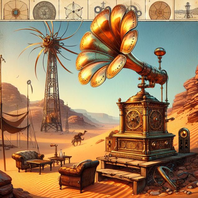 ChatGPT: Generate an image that combines the steampunk style with a serene scene in the Jordanian desert. Illustrate an intricately designed wind turbine, complete with brass gears and rivets, as it harnesses the power of the wind. Next to it, capture a cozy living room exuding vintage charm, with a classic record player adorned with intricate brass details. Show the warm, nostalgic music filling the room, evoking a sense of peaceful nostalgia in the desert setting.