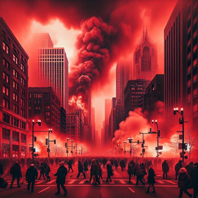 ChatGPT: In downtown Chicago, a thick layer of smog hangs heavily in the air, obscuring the skyline and casting an eerie red tint over the city. As the pollution worsens, tensions rise, and people become visibly agitated. In the background, several buildings are ablaze, their fiery glow contrasting starkly against the polluted atmosphere. The combination of air pollution and arson has created a scene of chaos and destruction.